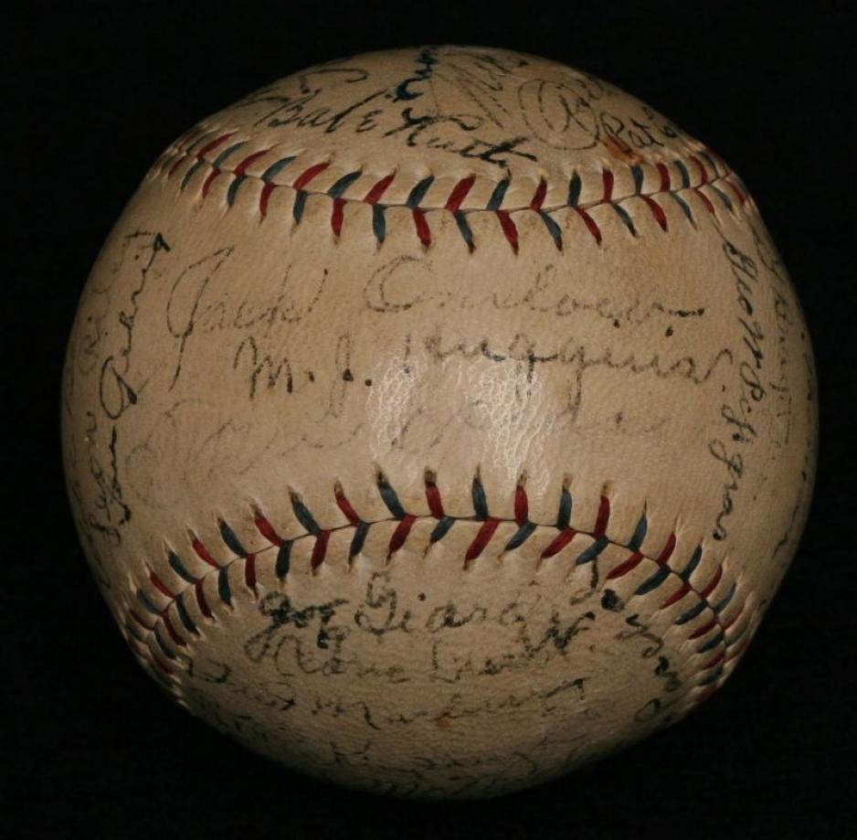 Signatures include HOF Babe Ruth, Lou Gehrig, Miller Higgins, Tris Speaker, Walter Johnson, Herb Pennack, Earl Combs, and Waite Hoyt