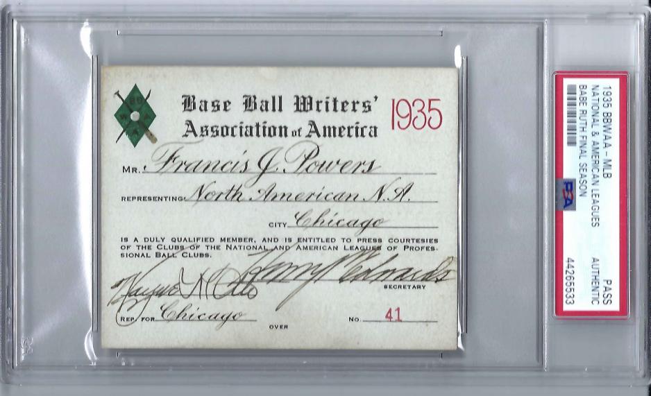 Browse All New ItemsPublications & TicketsVery Rare 1935 BBWAA-MLB Babe Ruth Final Season Boston Braves Valid For Home Runs # 712 # 713 and # 714 Condition PSA Grades Ticket Pass Authentic Only 1 Of 2 Known Highest Grade. $ 9500