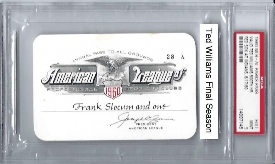 Browse All New ItemsPublications & TicketsVery Rare 1960 American League Ted Williams 500TH Home Run And Final Season Ticket PassTo All Grounds. Condition PSA Grades Ticket Pass MINT - 9 Only 1 Of 4 Known And Highest Grade. $ 2000