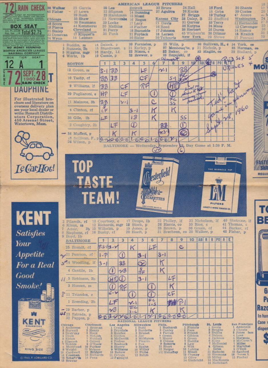 Sept. 28, 1960 Ted Williams played his last game. In his last time at bat, he hit his last Home Run.